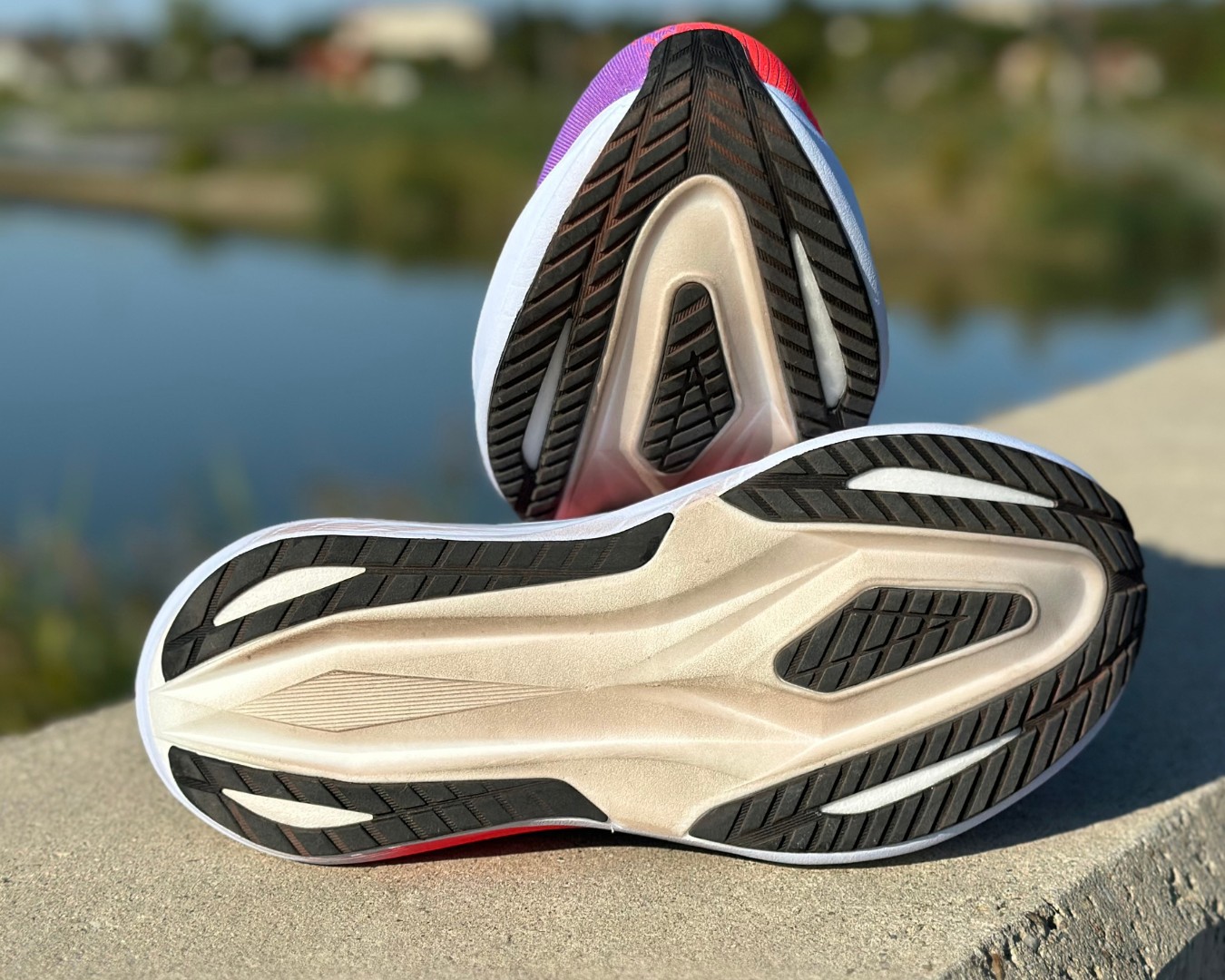 Ha nem tudnám, hogy nem így van, azt gondolnám, hogy karbonlemez van benne. Nagyon nehéz kézzel meghajlítani, megcsavargatni. A széles és merev középtalpnak köszönhetően a stabilitása is jó a futócipőnek, ahhoz képest, hogy 45 mm magas, és beérkezésnél nagyot tömörül. Elöl és hátul is hajlított a középtalp. Magasra hajlik fel elöl, de nem kezd el korán emelkedni, így a talp viszonylag nagy része érintkezik a talajjal, lapos. Ez szintén a stabilitást segíti.