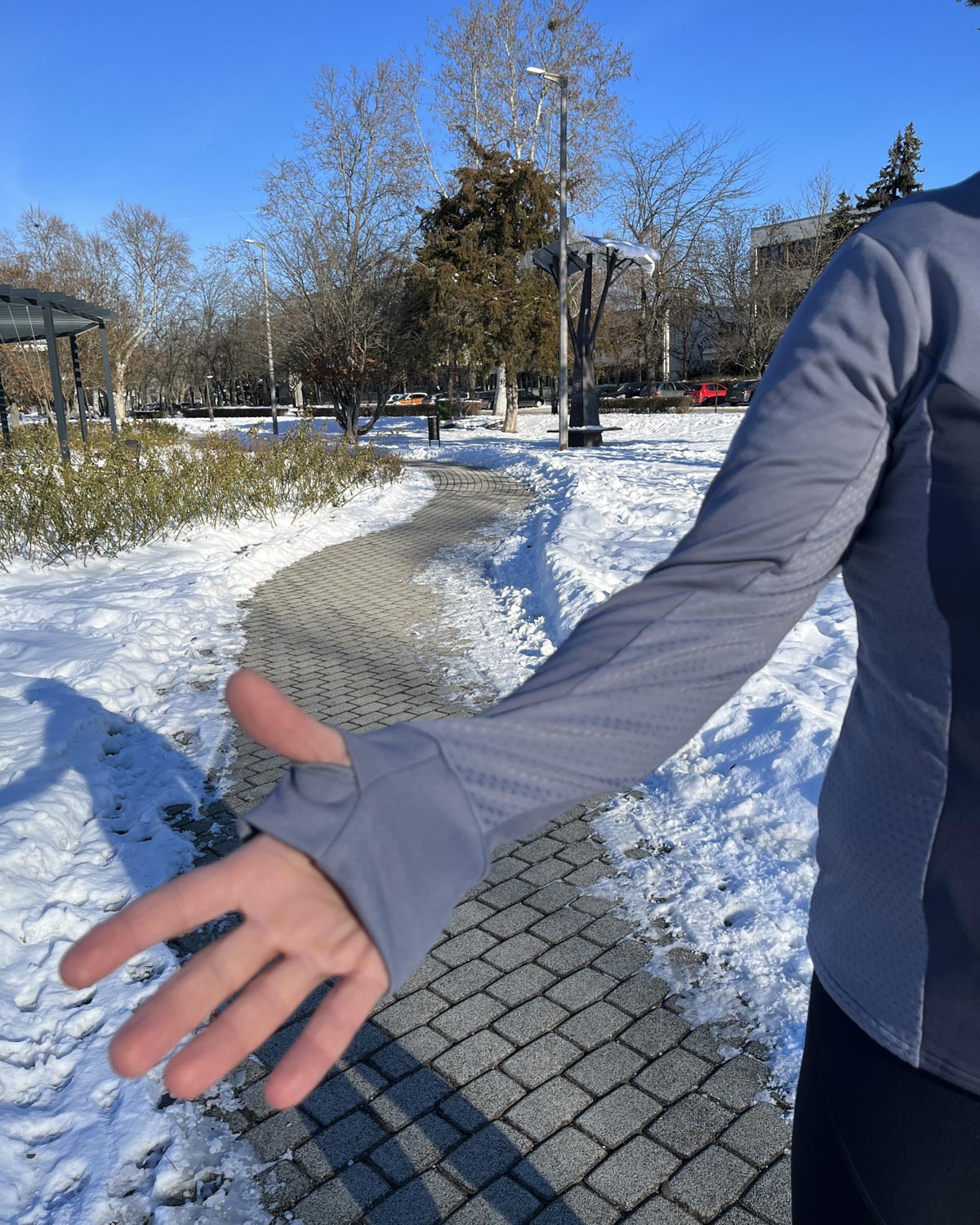 Ami még hasznos tulajdonsága lehet ezeknek a felsőknek, hogy sok modellnél a kézfejünkre rá tudjuk húzni a ruha ujját, ami extra melegséget ad, és többen kesztyű helyett ezt használják. Én ritkán szoktam így ráhúzni a felsők ujját a kézfejemre, mert szeretem, ha a csuklóm szellőzik a kesztyű mellett; csak nagyobb hidegben vagy ha már átfagytam, akkor használom így.