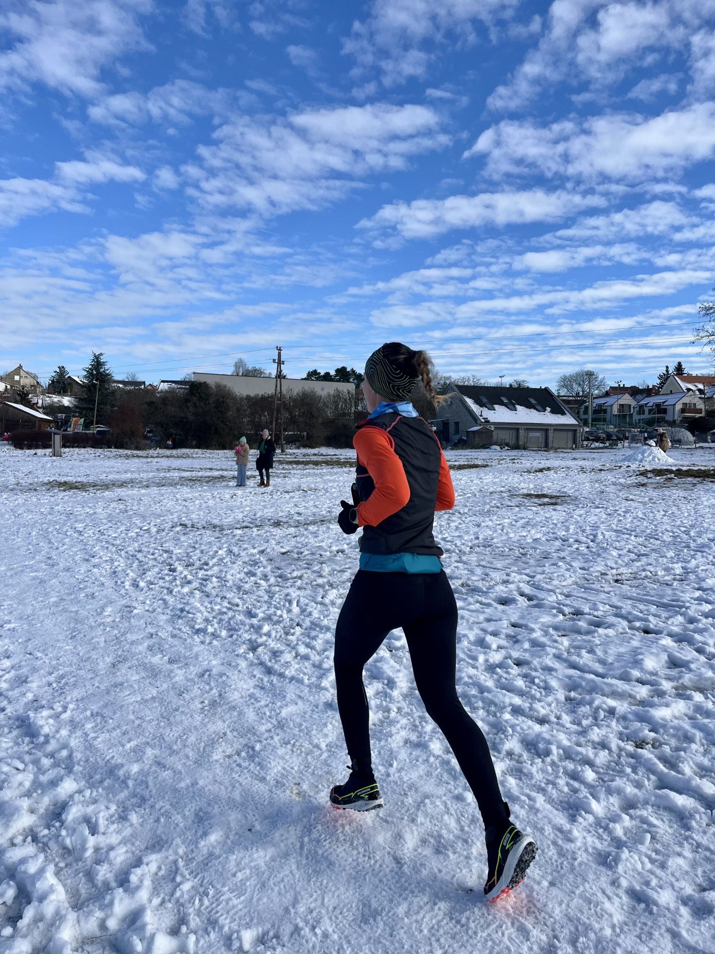 Ami a felszerelésemet illeti, sokat gondolkodtam azon, hogy milyen futócipőben és ruhában fussak, de az erősebb tempóra való tekintettel elegendő volt a vékonyabb aláöltöző egy mellénnyel, fejpánttal, kesztyűvel és csősállal, valamint a téli futónadrágom. Cipőnek viszont a Salomon Winter Cross Spike-ra volt szükségem. Kellettek a talpába épített szögek, hiszen nagyon csúszott a terep, indokolt volt az extra tapadás.